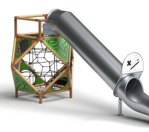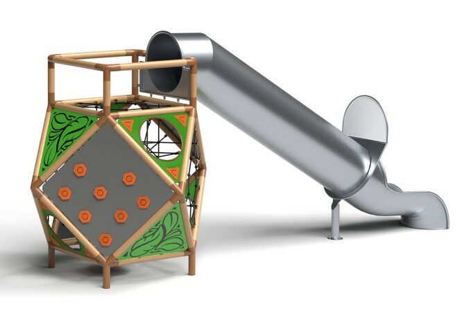 Klättersystemet består av en sfärisk modul och en rak rörrutschkana. Sfären är en arkimedisk kropp och tack vare sin åttkantiga symmetri och liksidiga radiella design bildar den en extremt stabil struktur som garanterar högsta möjliga säkerhet för användarna. Den sfäriska modulen har 24 identiska kanter som bildar strukturella rör av S235-stål, Ø 88,9 mm med en väggtjocklek på 2,6 mm, varmförzinkade och pulverlackerade. Alla strukturella element är sammanfogade med ett innovativt internt hylssystem som ger en stark och hållbar förbindelse – vilket garanterar stabilitet även vid intensiv lek med upp till 18 barn.