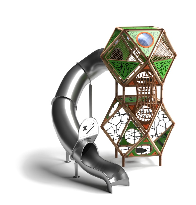 Klätterställningen består av två sammankopplade sfäriska moduler och en lång, böjd tunnelrutschkana. Varje sfär är ett arkimediskt fast kropp – med åttkantig symmetri och liksidig radiell konstruktion – som bildar en extremt stabil struktur som garanterar högsta möjliga säkerhet för användarna. Varje sfärisk modul har 24 identiska kanter som bildar strukturella rör av stål (Ø 88,9 mm, väggtjocklek 2,6 mm), varmförzinkade och pulverlackerade. Modulerna är sammankopplade med ett innovativt internt hylssystem som ger starka och hållbara fogar – vilket bibehåller stabiliteten även vid intensiv lek med upp till 19 barn.